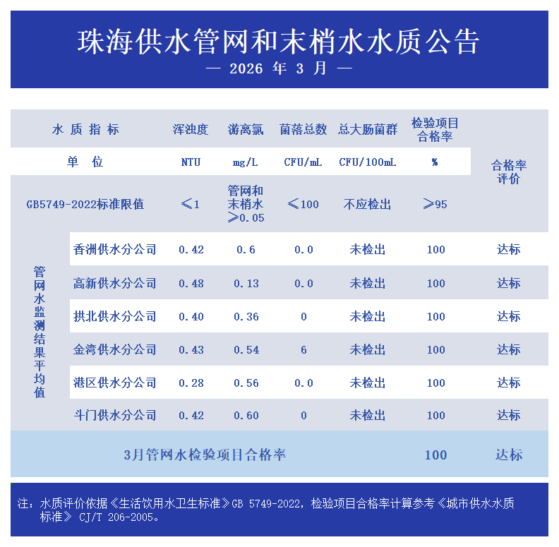 2026年3月珠海供水管網(wǎng)和末梢水水質(zhì)公告 發(fā)布時(shí)間:2026年04月15日 瀏覽次數(shù): 次 小大 原文下載:2026年3月珠海供水管網(wǎng)和末梢水水質(zhì)公告.pdf 【打印正文】