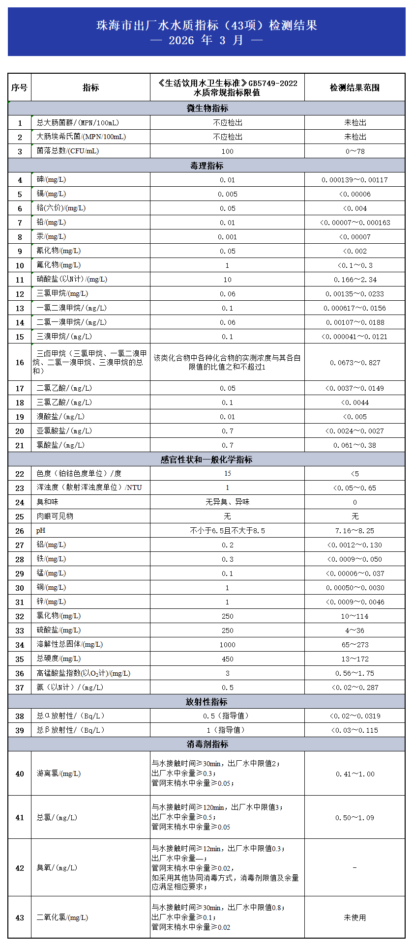 2026年3月珠海市出廠水水質(zhì)指標(biāo)(43項)檢測結(jié)果 發(fā)布時間:2026年04月15日 瀏覽次數(shù): 次 小大 原文下載:2026年3月珠海市出廠水水質(zhì)指標(biāo)(43項)檢測結(jié)果.pdf 【打印正文】
