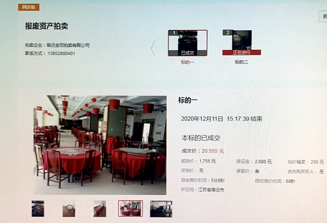 12月11日下午3時,城發(fā)公司部分報廢廚具、桌椅等物資網(wǎng)上拍賣開始,10家競買人,經(jīng)過17分39秒90次的緊張激烈競價,最終以20555元成交標(biāo)的,比評估價超出10倍。
