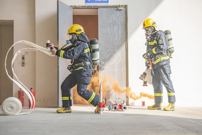 此次演練完全按照“真實模擬火場、現(xiàn)場領受任務、無預案戰(zhàn)斗展開”模式進行,災情假設為B10二層服裝加工企業(yè)起火,該企業(yè)立即啟動自救預案并撥打消防報警電話。園區(qū)消防應急救援大隊接警后,一次性調派2輛消防車11名消防戰(zhàn)斗員趕赴處置,演練過程中按照救人第一的指導思想,科學施救,內攻滅火、內攻搜救、外圍控火、緊急撤離等技戰(zhàn)術措施控制火勢,消滅火災。